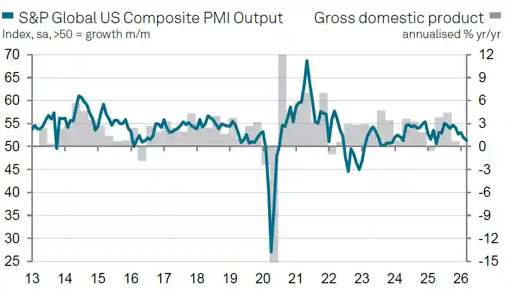 Głównym czynnikiem hamującym rozwój największej gospodarki świata jest eskalacja konfliktu zbrojnego na Bliskim Wschodzie, w który bezpośrednio zaangażowane są siły USA, Izraela oraz Iranu. Wskaźnik Flash U.S. Composite PMI Output Index, monitorujący kondycję sektorów produkcji i usług, spadł w bieżącym miesiącu do poziomu 51,4 punktu w porównaniu do 51,9 punktu odnotowanego w lutym.