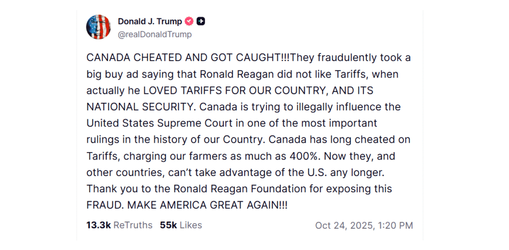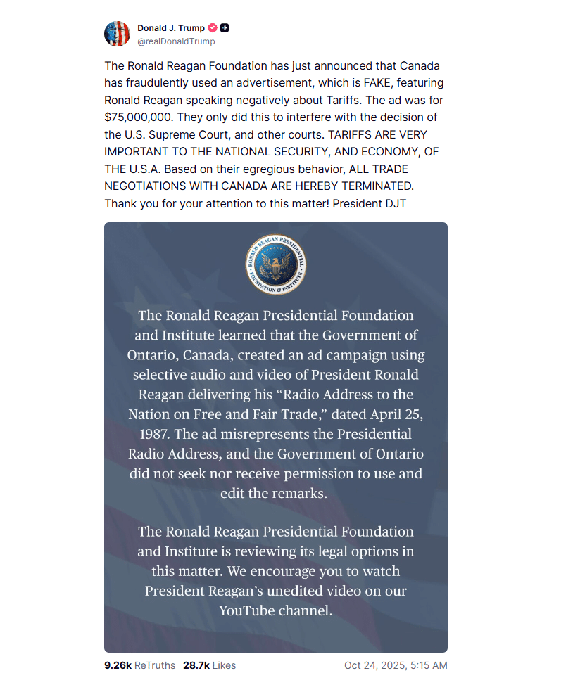Donald Trump ogłosił, że rozmowy na temat układu handlowego, jakie Stany Zjednoczone prowadziły – od dawna i w bólach – z Kanadą, zostają zerwane bez porozumienia. To reakcja na działania medialno-PR-owe, wymierzone w amerykańską publikę, jakie mieli podjąć Kanadyjczycy – a które w Białym Domu uznano za próbę manipulacji polityką, sytuacją prawną i wewnętrznymi nastrojami w USA.