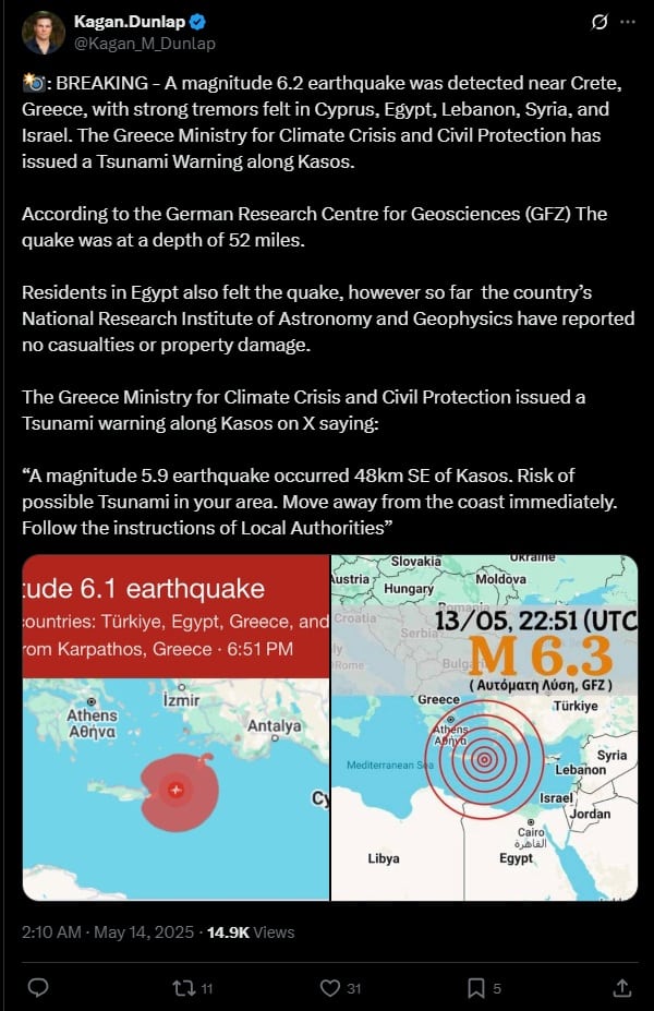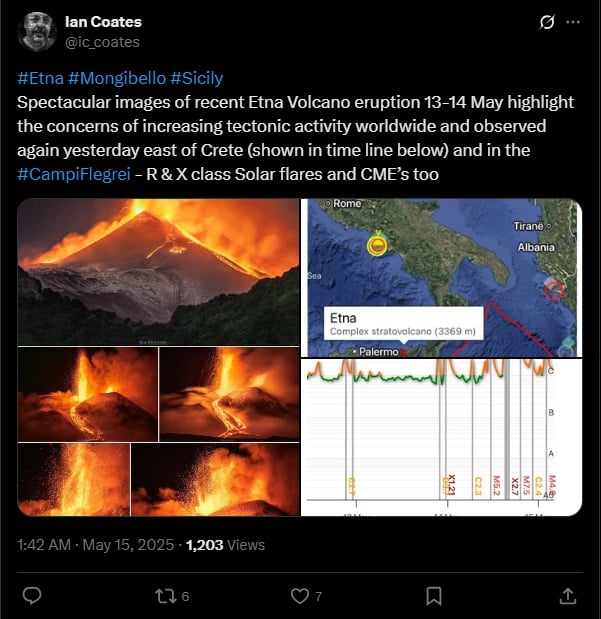 Wybuch wulkanu Etna to nie jedyna aktywność tektoniczna, jaką zanotowano w dniach 13-14 maja. Na obszarze Krety wykryto trzęsienie ziemi o magnitudzie 6,2, a silne wstrząsy odczuwalne były na Cyprze, w Egipcie, Libanie, Syrii i Izraelu. Ponadto Greckie Ministerstwo Kryzysu Klimatycznego i Ochrony Ludności wydało ostrzeżenie przed tsunami wzdłuż Kasos.