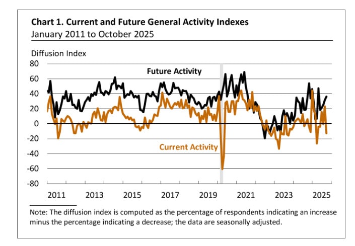 Na Wschodnim Wybrzeżu USA, w rejonie Filadelfii przyszła gospodarcza zima. Październikowy wskaźnik aktywności przemysłowej Philly Fed spadł do poziomu –12,8 punktu, z mocno dodatnich 23,2 miesiąc wcześniej. Rynek nie spodziewal się tak dużego spadku i oczekiwał odczytu na poziomie 10. To nie tylko gwałtowne tąpnięcie, ale i powrót w rejony nastrojów, które bardziej przypominają niepewność pierwszej połowy roku niż stabilność końcówki 2025.