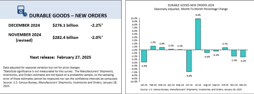 Wyłączając sektor transportowy, nowe zamówienia wzrosły o 0,3% m/m, ale po wyłączeniu sektora obronnego zamówienia spadły o 2,4% m/m. Zatem sprzęt transportowy, który odnotował spadek w czterech z ostatnich pięciu miesięcy, był głównym czynnikiem kryzysowym, odpowiadając za spadek w wysokości 6,9 miliarda dolarów.