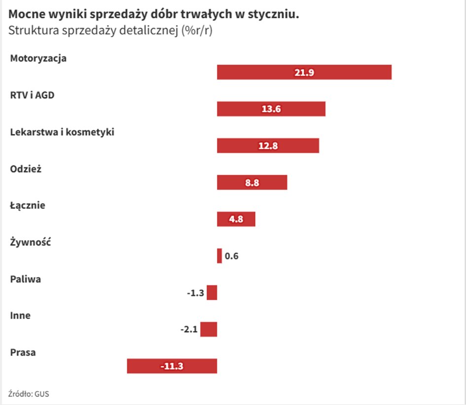 Styczeń 2025 roku przyniósł znaczące ożywienie w sprzedaży detalicznej, co może być oznaką stopniowego wzrostu konsumpcji prywatnej w Polsce. Dane Głównego Urzędu Statystycznego wskazują na wyraźny wzrost sprzedaży pojazdów oraz części motoryzacyjnych – aż o 21,9 proc. rok do roku. Poprawę odnotowano również w segmencie dóbr trwałego użytku, w tym sprzętu RTV, AGD oraz mebli, których sprzedaż wzrosła o 13,6 proc. w porównaniu z ubiegłym rokiem.