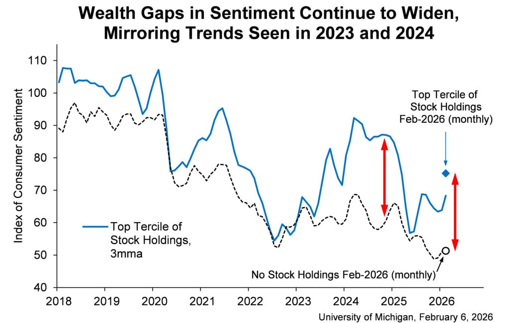 Jak podkreśla Joanne Hsu, dyrektor programu Surveys of Consumers, wzrost nastrojów był niemal w całości napędzany przez gospodarstwa domowe posiadające duże portfele akcji. W tej grupie sentyment wyraźnie wzrósł, korzystając z wcześniejszych zysków giełdowych. Wśród konsumentów bez ekspozycji na rynek kapitałowy nastroje pozostały na poziomach „depresyjnych” i praktycznie nie drgnęły.