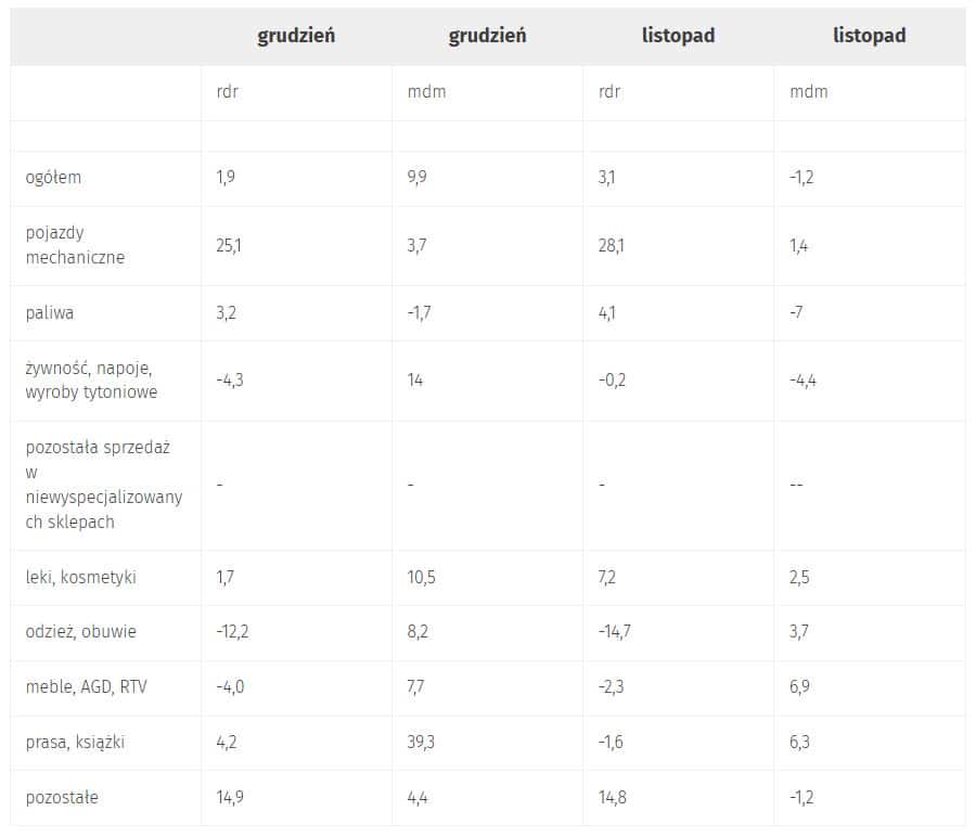 Sprzedaż pojazdów mechanicznych wzrosła w odpowiedzi na stabilizację cen, podobnie sprzedaż paliw. Natomiast prasa i książki sprawdzają się jako 'tańsze zamienniki’, niejednokrotnie w formie prezentów. Grudzień przyniósł pierwszy od dawna spadek miesięcznej sprzedaży paliw, co wskazuje, że może sugerować, że dużo mniej Polaków na święta zdecydowało się na podróże.