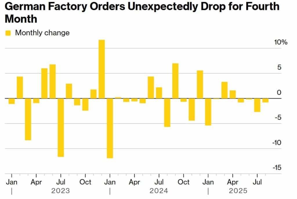 To miał być moment, w którym niemiecka gospodarka (po dwóch latach recesyjnego marazmu) wreszcie złapie oddech. Tymczasem sierpniowe dane z przemysłu znów studzą entuzjazm. Zamówienia w niemieckich fabrykach spadły o 0,8% w ujęciu miesięcznym, zamiast oczekiwanego wzrostu o 1,2%. To już czwarty z rzędu miesiąc spadków. Zamówienia spadły w poprzednim miesiącu o -2,9% miesięcznie. To sygnał, że maszyna, która przez dekady napędzała europejską gospodarkę, ale nie wraca na pełne obroty.