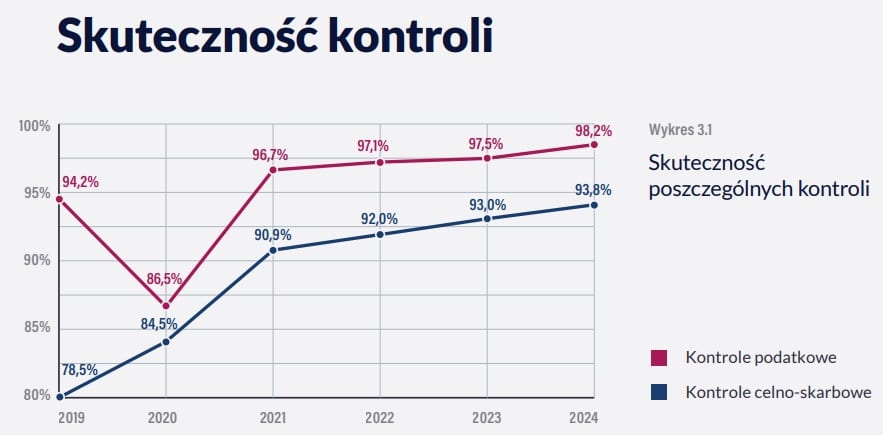 Fiskus chwali się również, że aż 98,2 przeprowadzonych kontroli oraz 93,8% kontroli celno-skarbowych było skutecznych. Tylko w 2024 r. aż 98 na 100 zakończonych kontroli podatkowych skutkowało wykryciem nieprawidłowości.