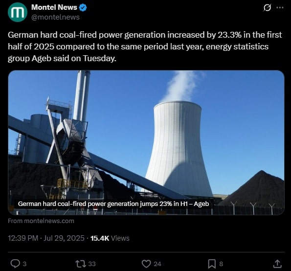Portal Montel News, który zajmuje się branżą energetyczną, opublikował kilka dni temu najnowsze dane dotyczące produkcji energii w Niemczech. Z ustaleń portalu wynika, że w pierwszym półroczu 2025 roku Niemcy zwiększyły produkcję energii z węgla kamiennego aż o 23,3% w porównaniu do analogicznego okresu rok wcześniej. Dane pochodzą od firmy AGEB, która zajmuje się statystykami energetycznymi.