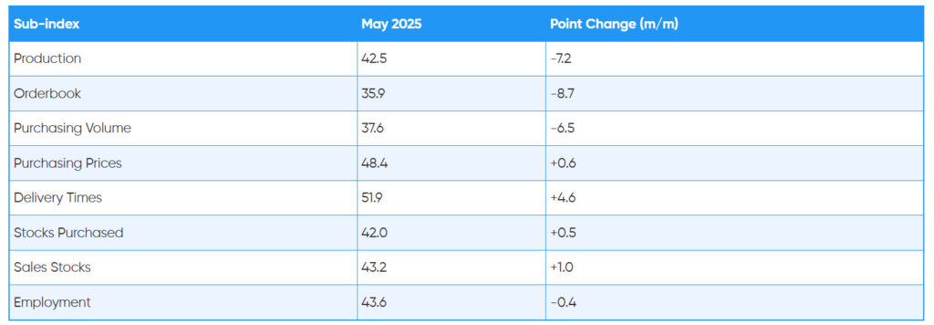 Produkcja obniżyła się aż o 7,2 pkt do poziomu 42,5, zamówienia spadły drastycznie do 35,9 pkt (spadek aż o 8,7 pkt), a wolumen zakupów znalazł się na poziomie 37,6. Nawet jeśli obawy o protekcjonizm chwilowo ucichły, niepewność związana z polityką handlową USA nadal tłumi nastroje i zaufanie biznesu.