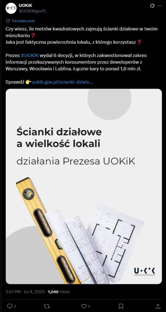 Kontrola wykazał również, że jeden podmiot, pomimo zawartej na kartach lokali informacji o powierzchni pod ściankami działowymi, nie wliczał tej powierzchni do całkowitej powierzchni lokalu mieszkalnego wyszczególnionej w umowie deweloperskiej.