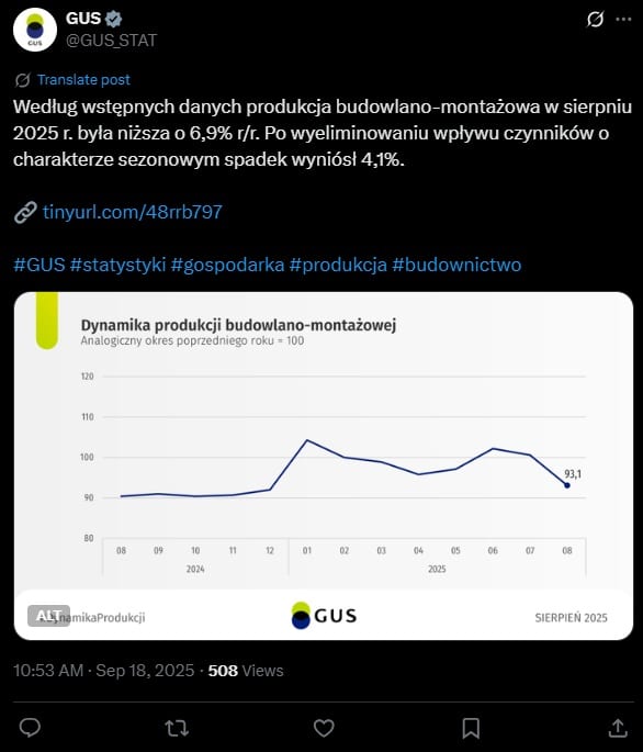 Pod koniec tygodnia pojawiły się kolejne dane z branży, które również informują o spadkach. Tym razem dotyczą one produkcji budowlano-montażowej. Według danych GUS produkcja budowlano-montażowa zrealizowana na terenie kraju w sierpniu 2025 r. była niższa o 6,9% w porównaniu z sierpniem ubiegłego roku. Wskaźnik spadł również o 8,9% w odniesieniu do lipca bieżącego roku.