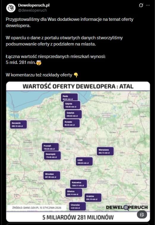 Dane dotyczące oferty ATAL-a są jednym z najmocniejszych sygnałów ostrzegawczych obecnego etapu cyklu. Według zestawienia opartego danych uzyskanych przez Deweloperuch.pl łączna wartość niesprzedanych mieszkań spółki wynosi 5 mld 281 mln zł. To liczba, która sama w sobie nie byłaby problemem w fazie boomu, ale w warunkach spowalniającej absorpcji rynku nabiera zupełnie innego znaczenia.
