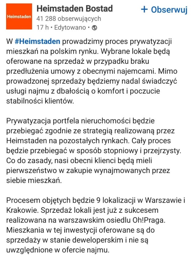 Od ponad miesiąca na rynku krążą informacje o wycofaniu się z rynku wielu funduszy inwestycyjnych, które skupowały i wynajmowały mieszkania. Przez wiele miesięcy to one były pośrednimi beneficjentami rozpasanych programów fiskalnych, które rozpędziły ceny mieszkań. Przede wszystkim 'Bezpieczny Kredyt 2%’. Teraz gdy wiadomo już, że polski rząd wycofał się z obietnic wdrożenia kredytu 0%, a później 'Pierwsze Klucze’, panika wśród dużych posiadaczy nieruchomości rośnie… Po drugiej stronie rynku nie ma zbyt wielu kupujących. Poniżej przykład Heimstaden.