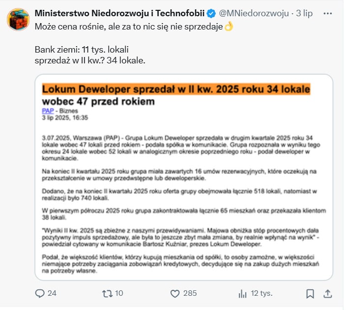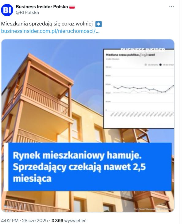 Czy ceny nieruchomości w Polsce w końcu się zawalą? Mimo nieco bardziej 'łagodnego tonu’ w Narodowym Banku Polskim i perspektywy obniżek stóp w Polsce … Liczba kupujących jest wciąż nieadekwatnie niska do ilości oferowanych lokali. Wobec nadmuchanych cen i wysokich oczekiwań sprzedających czas oczekiwania na finalizację transakcji poważnie spadł. Perspektywa kolejnych obniżek stóp w Polsce nie rozruszała rynku na tyle, by perspektywa poważnych spadków cen oddaliła się na dobre. Deweloperzy aktualizują ceny mieszkań zgodnie z nowymi regulacjami… W niektórych przypadkach ceny ofertowe są niższe o nawet 10% r/r.