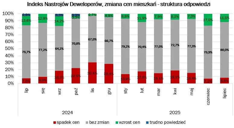 Ciekawostką jest wyraźny wzrost liczby mieszkań kupowanych przez cudzoziemców. W 2024 r. zarejestrowano ponad 17 tys. takich transakcji. Z tego połowę w największych miastach. To trend, który w dłuższej perspektywie może wpłynąć zarówno na rynek wynajmu, jak i ceny. W badaniach portalu TabelaOfert.pl aż 80% firm deweloperskich deklaruje, że nie planuje w najbliższych miesiącach zmieniać cen.
