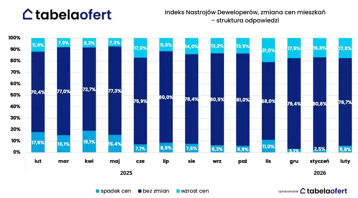 Najnowsze dane z marca 2026 roku płynące z indeksu nastrojów deweloperów portalu Tabelaofert.pl wskazują na wyraźne wyhamowanie optymizmu wśród firm budowlanych, co stanowi istotną zmianę względem poprzednich kwartałów. Podczas gdy jeszcze niedawno branża była przekonana o nieuchronnych wzrostach, obecnie aż 76,7 proc. deweloperów spodziewa się stabilizacji cen w najbliższych miesiącach.