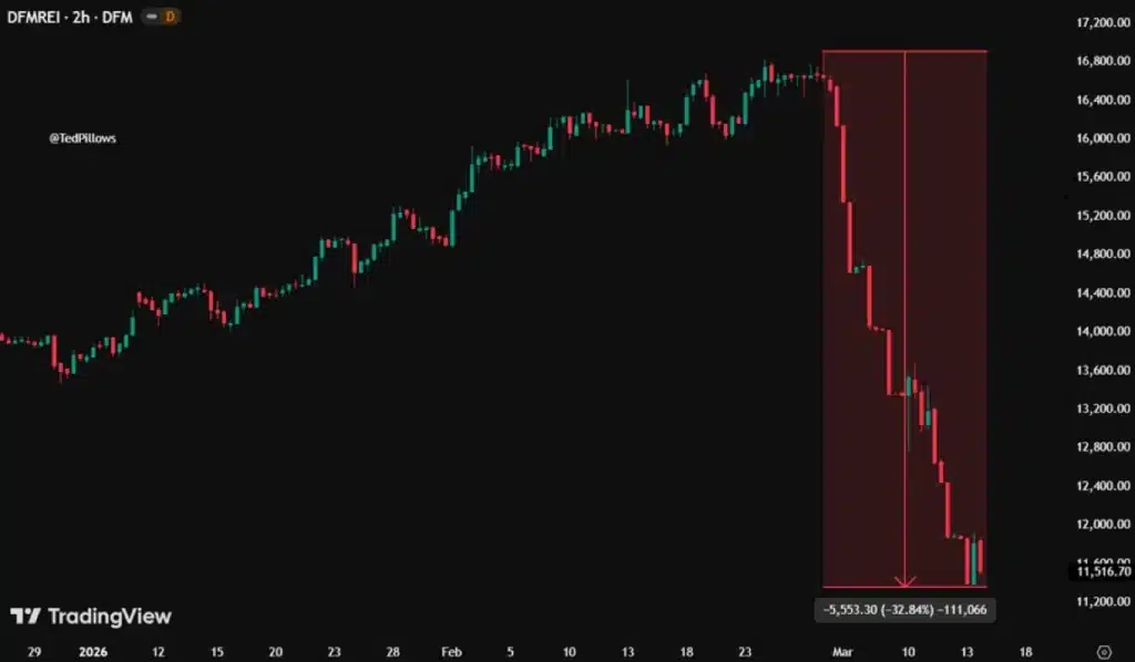 Skalę problemu z inwestycjami 'w beton’ może pokazać też Dubaj. Sprzedaż nieruchomości na Bliskim Wschodzie prawdopodobnie się załamie. Widok dronów atakujących wieżowce w dubajskiej marinie może być dla niektórych sygnałem do dywersyfikacji portfela i sprzedaży. W końcu Polska także położona jest w strefie 'podwyższonego ryzyka geopolitycznego’ a kapitał musi kalkulować ryzyko – niezależnie od tego, czy naprawdę się zmaterializuje. Indeks cen akcji dubajskich deweloperów spadł o prawie 33% w ciągu 9 dni. To daje do myślenia.