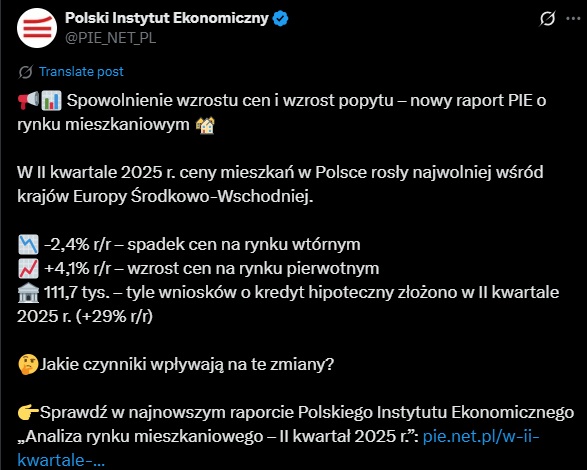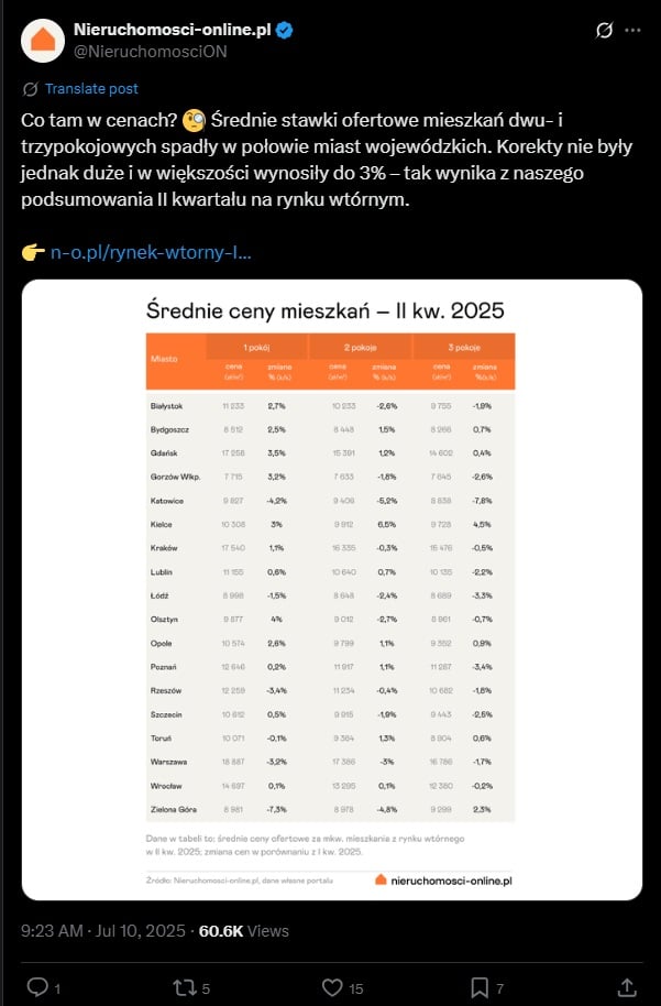 Kupujący oczekują tego typu informacji, ale wydaje się, że to jeszcze nie moment przełomu. Polski Instyt Ekonomiczny opublikował dane, które częściowo potwierdzają ustalenia portali. Z danych Instytutu wynika, że ceny nieruchomości na rynku wtórnym w II kwartale 2025 roku spadły o 2,4%. Jednak na rynku pierwotnym wzrosły o 4,1%.