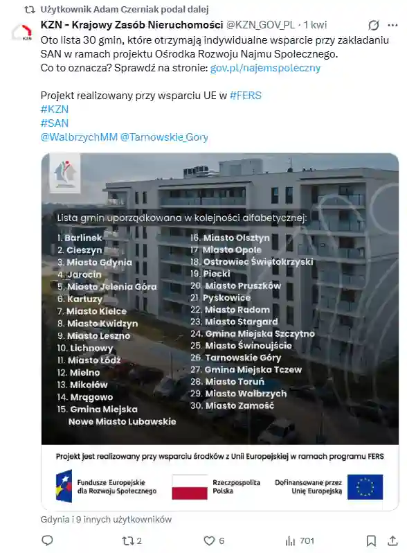 Specjaliści od rynku nieruchomości podkreślają, że rozwój budownictwa społecznego jest niezbędny dla zachowania balansu społecznego w dużych aglomeracjach. Obecnie na mapie Polski działa piętnaście takich agencji, jednak KZN właśnie wyłonił 30 kolejnych gmin, które otrzymają pełne wsparcie przy wdrażaniu tego systemu na swoim terenie.