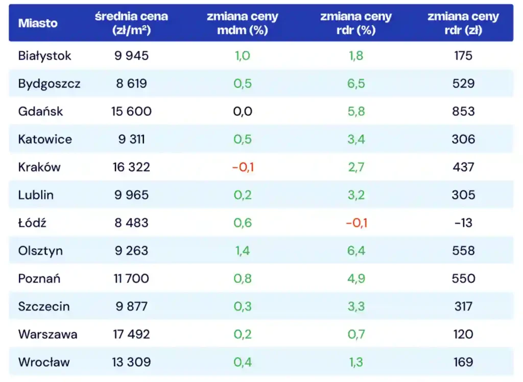 W ciągu ostatnich dwunastu miesięcy w miastach takich jak Poznań, Olsztyn, Bydgoszcz oraz Gdańsk średnie ceny ofertowe poszybowały w górę w przedziale od 4,9 proc. do 6,5 proc. W praktyce oznacza to, że za każdy metr kwadratowy mieszkania z drugiej ręki trzeba zapłacić obecnie o ponad 500 zł więcej niż w analogicznym okresie roku ubiegłego. Statystyki te kontrastują z danymi z Białegostoku, Wrocławia i stolicy, gdzie roczne podwyżki nie przekroczyły 2 proc., co przekłada się na nominalny wzrost o około 200 zł za metr.