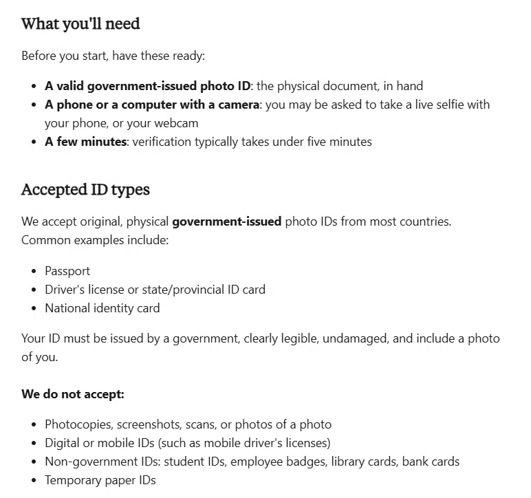 Przy okazji publikacji Claude Opus 4.7, Anthropic zdecydowało się także na zaktualizowanie swojego regulaminu. Uwagę internautów przykuła jedna kwestia, która jest zupełną nowością w przypadku korzystania z modeli tej firmy. Otóż od teraz nowi użytkownicy Claude będą musieli zweryfikować się za pomocą oficjalnego dokumentu, takiego jak dowód osobisty, prawo jazdy czy paszport. Jak możemy przeczytać na oficjalnej stronie supportu Claude, wprowadzenie weryfikacji nowych kont ma na celu zapobieganie potencjalnym nadużyciom. Kolejne powody, które podaje firma, to dostosowanie się do wymogów prawnych w niektórych krajach. Można więc powiedzieć, że Anthropic idzie śladem Komisji Europejskiej. Wczoraj Ursula Von der Leyen ogłosiła, że unijna aplikacja do weryfikacji wieku jest już niemal gotowa.