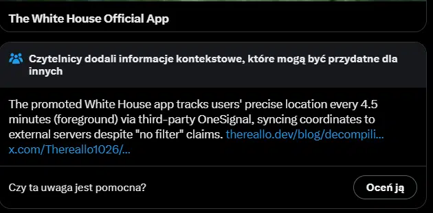 Na moment pisania tego artykułu, Biały Dom nie odniósł się do kontrowersji wokół swojej aplikacji. Natomiast warto wspomnieć, że oryginalny Tweet promujący „The White House App” otrzymał od portalu X tak zwaną notkę społeczności. Dotyczy ona opisywanej przez nas sprawy i informuje czytelników, że aplikacja sprawdza lokalizację użytkowników.
