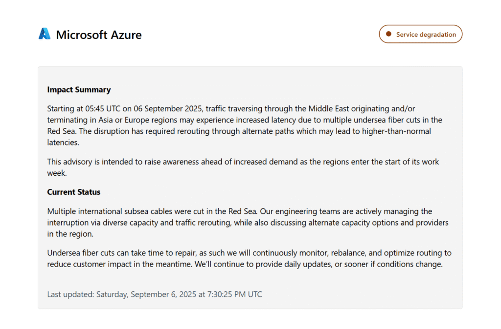 Zgodnie z komunikatem dot. Stanu Usługi (Service Health Status), użytkownicy chmury Azure mogą doświadczyć „narastających opóźnień”. W szczególności dotyczy to podmiotów oraz odbiorców, którzy korzystają z Azure’a z wykorzystaniem połączeń przebiegających przez Bliski Wschód, a kończących się w Azji lub Europie. Opóźnienie będzie skutkiem wzmożonego ruchu sieciowego, z którym będzie musiała sobie poradzić zredukowana liczba arterii światłowodowych.