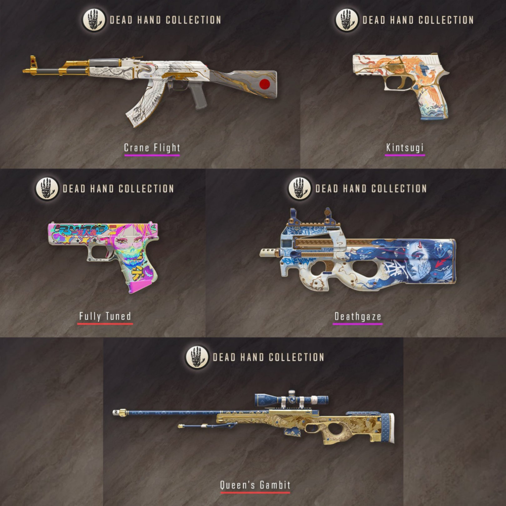 Nowa kolekcja to aż siedemnaście nowych skórek do broni, w tym czerwony skin do AWP – Gambit Królowej czy różowy AK-47 żurawi lot. Fani pistoletów też znajdą coś do siebie, choćby czerwony Glock-18 Fully Tuned czy różowe P250 Kintsugi. Najciekawsze skiny z nowej kolekcji The Dead Hand możecie zobaczyć poniżej: