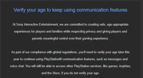 Jakiś czas temu, weryfikację wieku wprowadził m.in. Discord czy Roblox. Jak się okazuje, również i na konsolach będziemy musieli potwierdzać swój wiek. Gracze Playstation z Wielkiej Brytanii i Irlandii mocno się zdziwili, gdy w ostatnich dniach na ich skrzynki mailowe przyszły maile od Playstation, informujące ich, że w późniejszym okresie 2026 roku będą musieli zweryfikować swój wiek. Jak tłumaczy firma, jest to wymuszone dostosowaniem się do globalnych przepisów.
