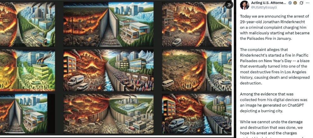 W raporcie czytamy, że Rinderknecht kilka miesięcy przed pożarem poprosił ChatGPT o stworzenie „dystopijnego obrazu przedstawiającego płonący las i ludzi uciekających przed ogniem”. W innym promptcie napisał: „Spaliłem Biblię, czułem się wyzwolony.”