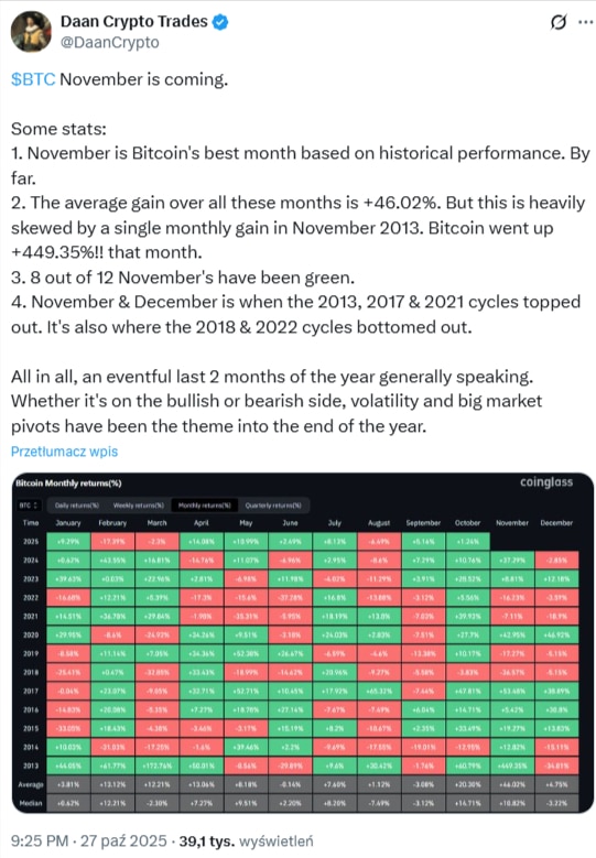 Glassnode zauważyło również, że aktywność on-chain – w postaci aktywnych adresów, wolumenu transferów i opłat – również pozostaje niska, co świadczy o „spokojniejszym środowisku sieci” i konsolidującej się bazie użytkowników. Dopóki przekonanie inwestorów nie pogłębi się, a popyt się nie poszerzy, Bitcoin najprawdopodobniej pozostanie w trendzie bocznym, gdzie ostrożny optymizm stopniowo zastępuje pozycjonowanie defensywne. Warto zwrócić uwagę na szerszy kontekst rynkowy, gdzie sprzyjające sygnały wskaźnika RSI w połączeniu z oczekiwaną w przyszłości obniżką stóp procentowych przez Rezerwę Federalną USA (Fed) mogą w końcu być zapalnikiem do kolejnego silnego rajdu. Inny polski analityk, Karol Stadnik, jeszcze wcześniej w październiku zwracał uwagę na historycznie silny ten miesiąc i szanse na wzrosty do nawet 130 000 USD, jednocześnie przyznając, że już realizuje część zysków metodą uśredniania (DCA), co pokazuje zróżnicowanie podejścia nawet przy byczych prognozach.