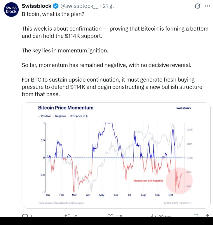 Kluczowym wymogiem dla byczego scenariusza jest utrzymanie wsparcia na poziomie $114 000, które BTC odzyskał po przebiciu 200-dniowej prostej średniej kroczącej (SMA) i psychologicznego poziomu $110 000. Analitycy z Swissblock podkreślają, że obecny tydzień ma być „potwierdzeniem” – udowodnieniem, że Bitcoin faktycznie formuje dno i jest w stanie obronić $114 000. Wskazali oni na potrzebę „zapłonu momentum”, czyli wygenerowania świeżej presji zakupowej, która pozwoli obronić ten poziom i zbudować nową byczą strukturę.