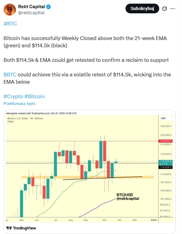 Również Daan Crypto Trades uznał, że utrzymanie 200-dniowej wykładniczej średniej kroczącej (EMA) na poziomie 114 000 USD jest niezwykle istotne dla dalszego kierunku ceny.