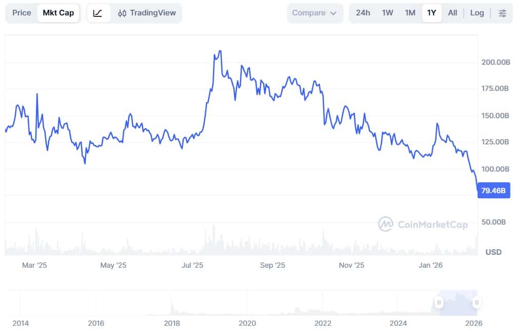 Jedną z głównych przyczyn tego stanu rzeczy jest bez wątpienia masowy odpływ kapitału. Od szczytu w lipcu 2025 roku całkowita kapitalizacja Ripple spadła o około 153%. Wówczas projekt zgromadził nieco ponad 210 mld dolarów. Od rekordowych poziomów stracił 130 mld dolarów i obecnie posiada około 80 mld dolarów. Tylko na początku tygodnia w jeden dzień projekt stracił około 20 mld dolarów.
