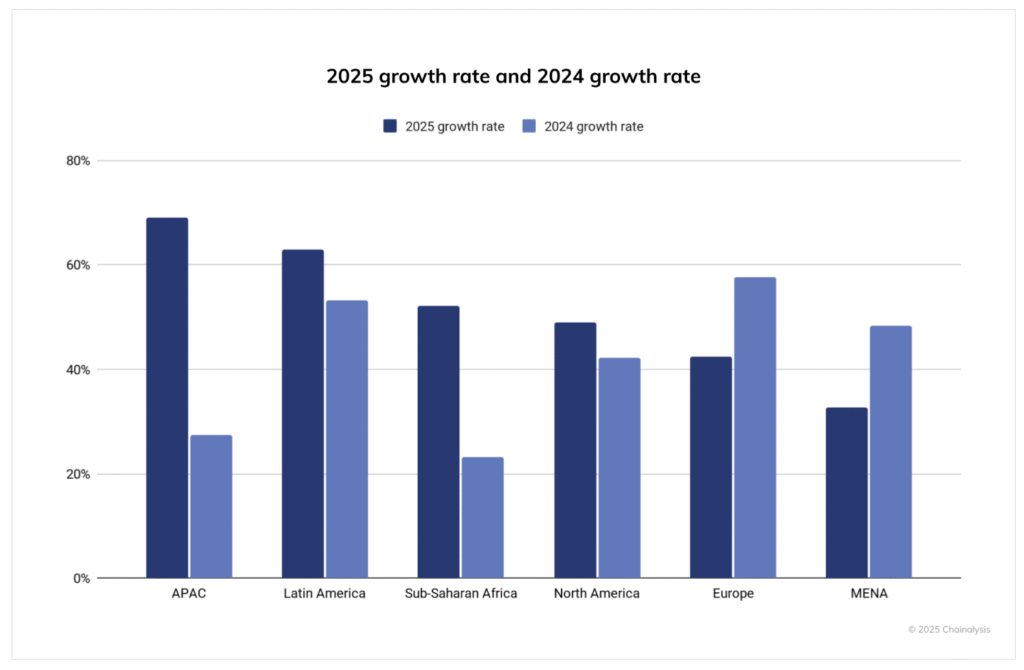 Według raportu Chainanalysis, w ciągu 12 miesięcy kończących się w czerwcu 2025, aktywność on-chain w regionie Azji i Pacyfiku wzrosła o 69% rok do roku. Łączny wolumen transakcji wzrósł z 1,4 biliona USD do 2,36 biliona USD. Region Azji i Pacyfiku umocnił swoją pozycję globalnego centrum głównie dzięki aktywności w Indiach, Wietnamie i Pakistanie.