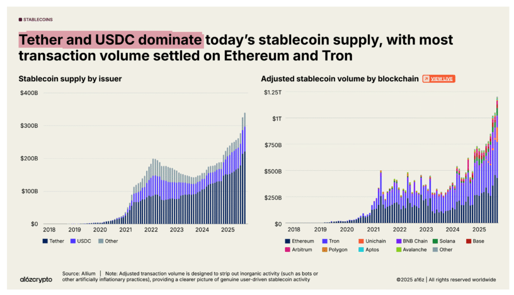 Dla przykładu wolumen transakcji stablecoinami w głównych łańcuchach, według danych z raportu a16z (State of Crypto Report 2025), osiągnął wyłącznie we wrześniu 2025 blisko 772 miliardy USD.