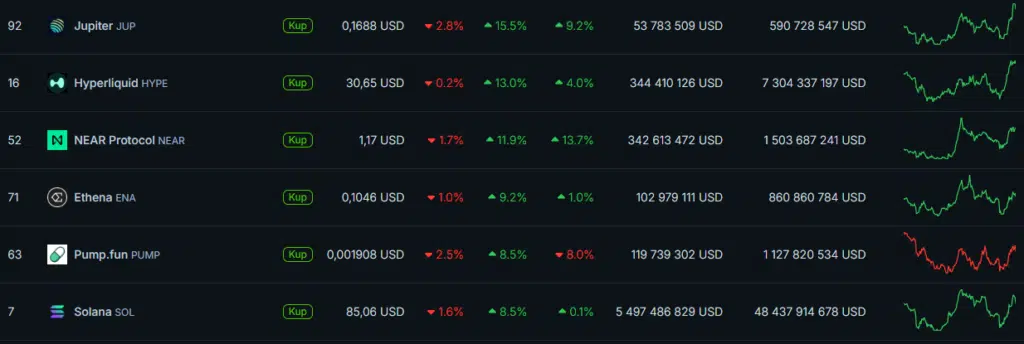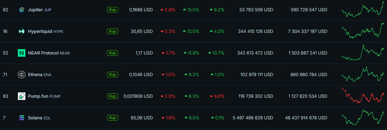 Na czele peletonu topowej setki pod względem kapitalizacji całkowitej znalazł się Jupiter (JUP), jeden z kluczowych projektów działających na Solanie. Token zyskiwał w przedziale ostatnich 24 godzin dwucyfrowo, pomimo krótkoterminowych wahań. Rynek wycenia tu przede wszystkim stałe przychody z opłat transakcyjnych oraz programy skupu tokenów z rynku, finansowane bezpośrednio z działalności protokołu.