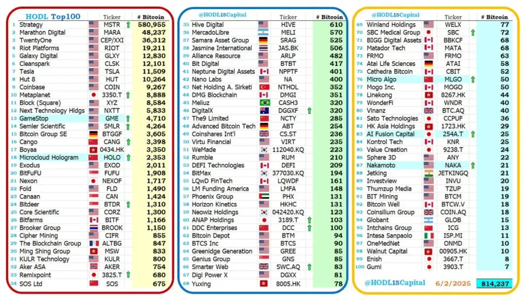 Najnowsze dane od HODL15Capital pokazują, że tempo wcale nie zwalnia. Wręcz przeciwnie. Czerwiec 2025 przyniósł kolejny przełom. Jak wynika z aktualizacji z 2 czerwca, łączna ilość BTC znajdująca się w portfelach 100 największych publicznych firm przekroczyła 814 000 sztuk. Co ciekawe, za ten wzrost odpowiada m.in. nowicjusz w tym zestawieniu – GameStop. Ci weszli do topowej setki razem z drzwiami.