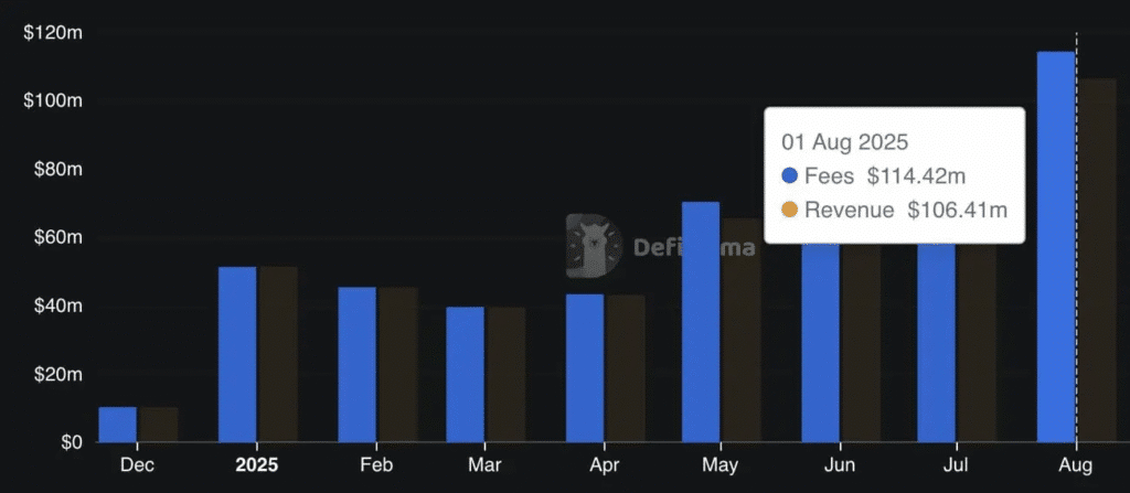 Jednym z najlepszych przykładów tej zmiany jest Hyperliquid. To zdecentralizowana platforma handlowa, która w sierpniu po raz pierwszy przekroczyła 100 mln dolarów przychodu w jeden miesiąc. Jeszcze pod koniec zeszłego roku przychody były dziesięciokrotnie niższe.