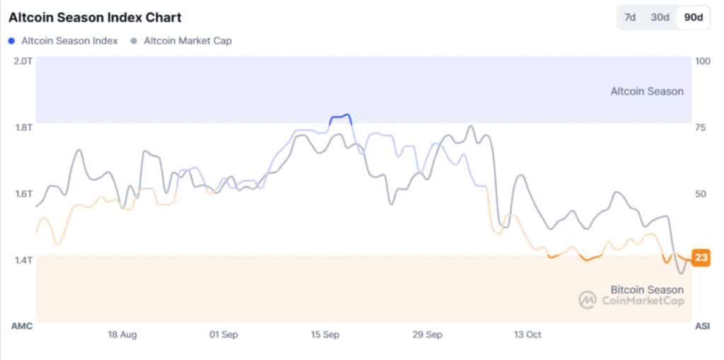Altcoin Season Index, nieoceniony instrument, który rzuca światło na wydajność altcoinów w stosunku do Bitcoina, spadł do rozczarowującego poziomu 23.