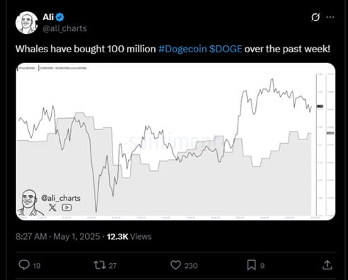 Wygląda jednak na to, że w trakcie ostatnich tygodni ożywienia na rynku, duzi posiadacze uznali, że warto zwiększyć zapasy DOGE w portfelach. Jak poinformował Ali Martinez, w jednym z najnowszych wpisów na X, wieloryby tylko w ciągu minionego tygodnia kupiły aż 100 mln sztuk Dogecoina.