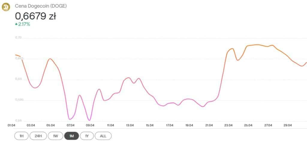 W chwili pisania tekstu DOGE kosztuje 0,17 USD, a w ciągu ostatnich 24 godzin zyskał na wartości 3,70%. Przez ostatni tydzień moneta ani znacząco nie straciła, ani nie zyskała (- 0,067%). Natomiast przez ostatni miesiąc altcoin zyskał na wartości 7.07%. Jednak wciąż jest co odrabiać. Od początku roku Dogecoin spadł aż o 43,36%.