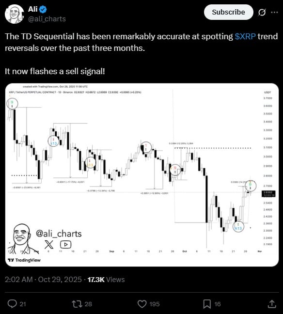 Martinez dostrzegł, że w ciągu ostatnich trzech miesięcy TD Sequential wykazał się niezwykłą dokładnością w wykrywaniu odwróceń trendu na XRP. Jak ocenił ekspert, wskaźnik ponownie sygnalizuje możliwy spadek, szacunkowo do nawet dwóch dolarów. Dlatego Martinez twierdzi, że TD Sequential „wysyła teraz sygnał sprzedaży!”.