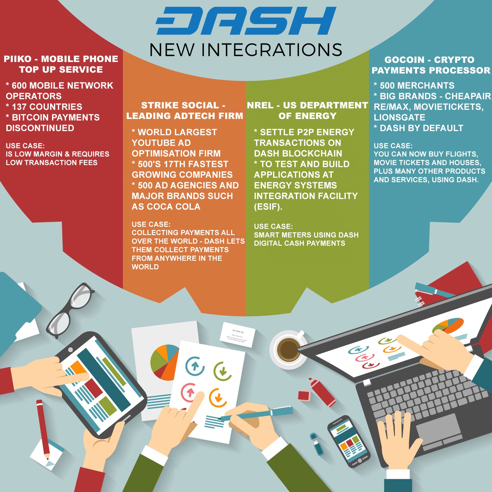 DashDrive jest elementem projektu, który upodabnia się do innych już znanych kryptowalut jak Siacoin, STORJ, Maidsafe. Dashdrive będzie jednak bardzo związany z samym Dash dlatego, że wyłącznie użytkownicy systemu będą mogli korzystać z tej funkcji, co nie będzie powieleniem takiej aplikacji jak Dropbox. DAPI zwiększy możliwości projektu i doprowadzi do większego zastosowania na dosłownie każdym serwerze. Styczeń był czasem gdy ogłoszono nowych partnerów DASHa, którzy będą wykorzystywali kryptowalutę w swoich produktach. Oto przykłady: