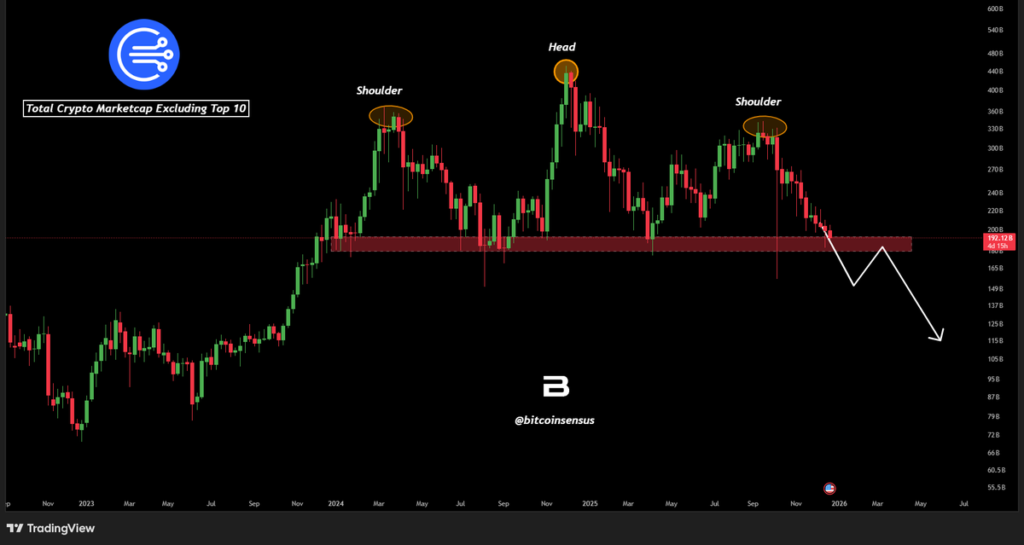 Na rynku altcoinów zapala się techniczna lampka ostrzegawcza. I to taka, obok której nawet doświadczeni traderzy rzadko przechodzą obojętnie. Wykres kapitalizacji rynku kryptowalut z wyłączeniem TOP10 rysuje bowiem klasyczną formację głowy z ramionami. Strukturę, która bardzo często pojawia się w momentach przesilenia trendu. Kluczowe nie jest jednak samo ułożenie świec, ale miejsce, w którym dziś znajduje się cena. Prawe ramię zostało już uformowane. Teraz rynek dociska dokładnie do linii szyi, czyli poziomu wsparcia, który w przeszłości był broniony kilkukrotnie. To właśnie tu przestaje się wahać i zaczyna podejmować decyzje.