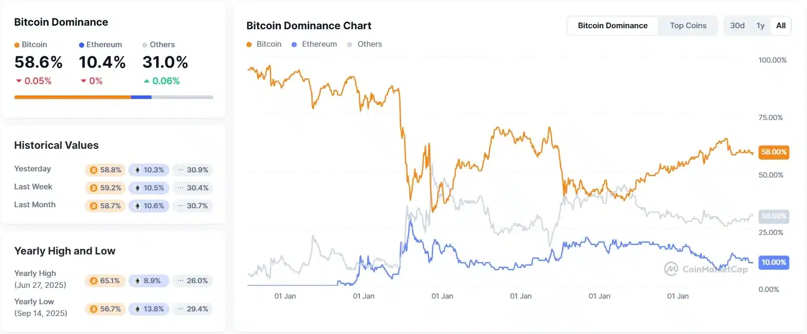 Również wskaźnik dominacji Bitcoina, na razie nie sugeruje, by altcoiny miały przejąć rynek. Pomimo krachu z października dominacja Bitcoina wciąż jest dość wyraźne. Obecnie indeks wskazuje, że 58,6% całkowitego kapitału ulokowanego w kryptowalutach znajduje się w BTC. Zaledwie 10,4% kapitału znajduje się w Ethereum. Wszystkie pozostałe altcoiny dostępne na rynku zgromadziły łącznie 31% kapitału.