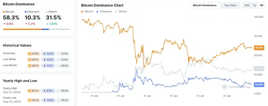 Pomimo krachu z października dominacja Bitcoina wciąż jest dość wyraźne. Obecnie indeks wskazuje, że 58,3% całkowitego kapitału ulokowanego w kryptowalutach znajduje się właśnie w BTC. Zaledwie 10,3% kapitału znajduje się w Ethereum. Wszystkie pozostale altcoiny dostępne na rynku zgromadziły łącznie 31,5% kapitału.