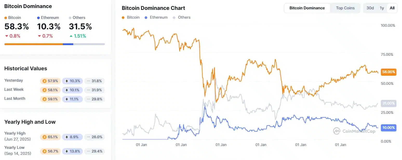 Pomimo krachu z października dominacja Bitcoina wciąż jest dość wyraźne. Obecnie indeks wskazuje, że 58,3% całkowitego kapitału ulokowanego w kryptowalutach znajduje się właśnie w BTC. Zaledwie 10,3% kapitału znajduje się w Ethereum. Wszystkie pozostale altcoiny dostępne na rynku zgromadziły łącznie 31,5% kapitału.