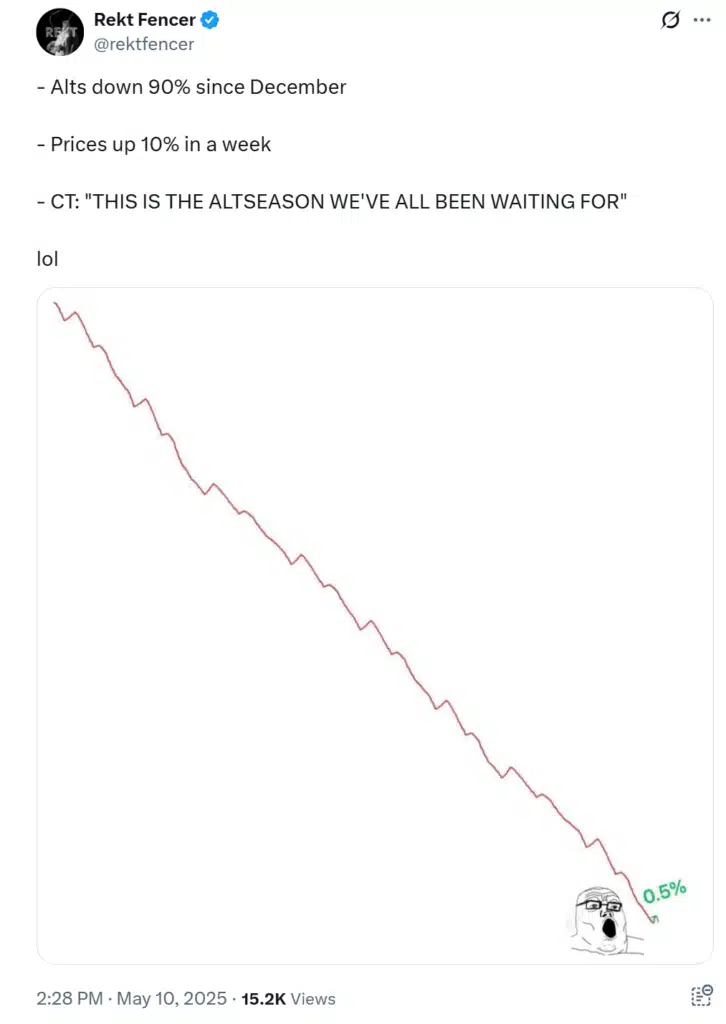 Jednak sceptycy, jak Rekt Fencer, przypominają, że wiele altcoinów wciąż jest 90% poniżej szczytów z grudnia 2024 roku, a obecne 10% odbicie może być przesadnie optymistyczne.