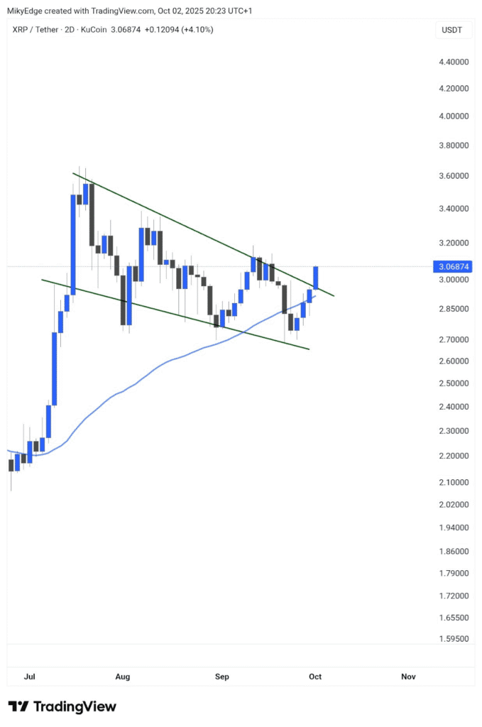 Na wykresie dwudniowym XRP pomyślnie przebił strefę oporu 3,05–3,10 USD. Zatem pokonał kluczową barierę, którą wielu uważnie obserwuje od miesięcy. To wybicie sygnalizuje wyraźne przejście z momentum niedźwiedziego na bycze. Wielu analityków postrzega to jako początek nowego wzrostu.