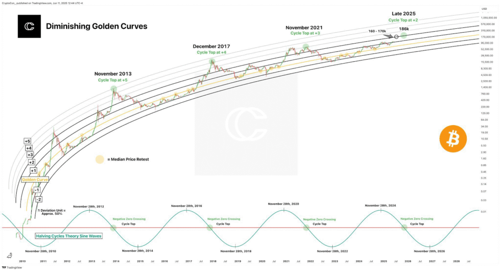 Prognoza ta opiera się na modelu „Diminishing Golden Curves”, czyli opartym na danych modelu stworzonym przez CryptoCon, który przez ponad dekadę dokładnie przedstawiał cykliczne szczyty i korekty Bitcoina.